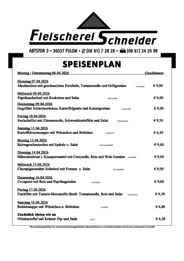Hier finden Sie unser aktuelles Wochenmenü. Wir sind stets bemüht Ihnen einen abwechslungsreichen Mittagstisch anzubieten. Neben den meist gutbürgerlichen Hauptgerichten wird auch eine große Auswahl von Beilagen und vegetarischen Mittagessen täglich frisch für Sie zubereitet. Sie können sämtliche Speisen bei uns vor Ort genießen oder auch mitnehmen.